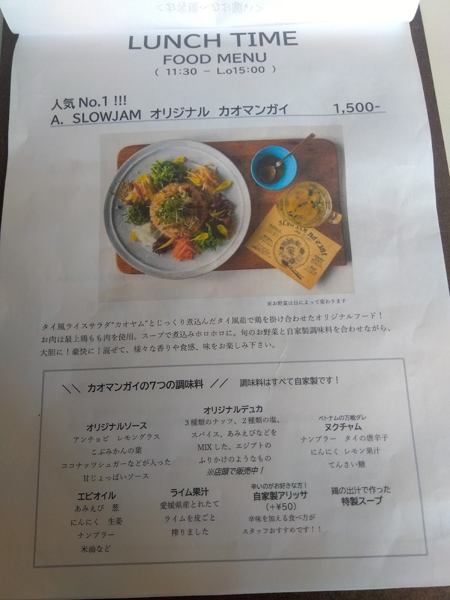 Welcome to THEATER SIDE CAFE SLOW JAM スロージャム, a culinary gem nestled in Yamagata, Japan, where vibrant flavors and comforting ambiance come together. The menu features a delightful array of Thai-inspired dishes, including the standout カオヤム—a colorful rice salad topped with your choice of tender chicken, succulent pork belly, or savory green curry-spiced soybean meat. Each option is a feast for the senses, emphasizing fresh, local ingredients.